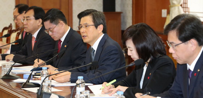 | 황교안 대통령 권한대행 국무총리(오른쪽 셋째)가 12일 서울 정부서울청사에서 열린 AI 관련 관계장관회의를 주재하고 있다. 연합뉴스 |