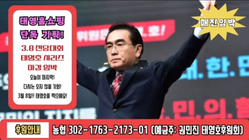 태영호 최고위원 후보는 홈쇼핑 방송에서 착안한 홍보 영상을 선보였다. 이른바 '태영홈쇼핑'이다. 영상에는 '태영 홈쇼핑 단독 기획, 3·8 전당대회 태영호 시리즈 마감 임박. 오늘이 마지막, 다시는 오지 않을 기회, 3월 8일 태영호를 찍으세요'라는 문구가 삽입돼 있다.