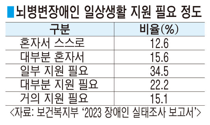 보건복지부가 발표한 '2023년 장애인 실태조사(전국 17개 시·도 등록 장애인 8천명을 대상)' 결과를 보면, 뇌병변장애인의 72%가 "일상생활에 타인 도움이 필요하다"고 답했다.