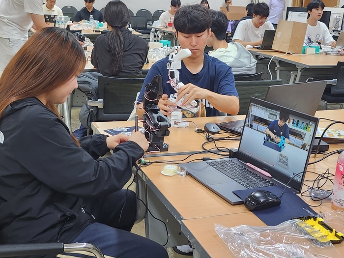 참가자들이 주어진 로봇팔(SO-101)을 정교하게 조립하며 구현 아이디어를 현실화하고 있다.