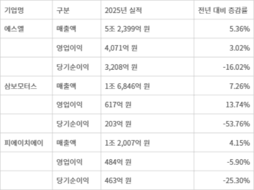 영남일보가 에스엘·삼보모터스·피에이치에이의 2025년도 사업보고서를 분석한 결과 이같은 흐름이 뚜렷해졌다. 에스엘은 지난해 5조2천억원을 웃도는 매출을 올렸다. 전년 대비 5% 이상 늘어난 수치다. 영업이익도 4천억 원을 넘기며 견고한 성장세를 증명했다. 그러나 당기순이익은 3천208억 원에 머물며 전년보다 16%가량 감소했다. 환율 변동에 따른 기타손실 증가와 폴란드 소재 연결기업의 170억원대 유형자산 손상차손이 장부에 반영된 탓이다. 본업의 수익이 아닌 영업외 요인으로 상당 부분 영향을 미친 것이다.